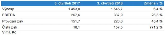 Za samotné třetí čtvrtletí firma vykázala tržby 1,55 miliardy Kč (meziročně +6,4 %), zisk EBITDA 337,9 milionu Kč (meziročně +26,3 %) a čistý zisk 157,5 milionu Kč (meziročně +771,2 %).