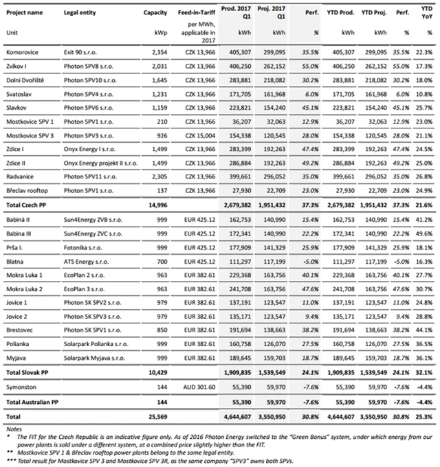 Výroba elektřiny v elektrárnách Photon Energy (1Q2017)