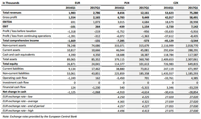 Na rovině zisku EBIT se společnost přehoupla ze ztráty 101 tisíc eur do zisku 264 tisíc eur. Jde již o šesté meziroční zlepšení čtvrtletního zisku EBIT v řadě. Na úrovni zisku před zdaněním sice společnost zůstala v červených číslech, ztrátu ale snížila z 1,318 milionu eur na 219 tisíc eur.