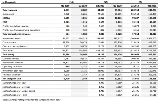 Za celé první pololetí společnost vykázala tržby 14,2 milionu eur, EBITDA 5,43 milionu eur, EBIT 1,73 milionu eur, ztrátu před zdaněním 1,7 milionu eur a čistou ztrátu 2,68 milionu eur.