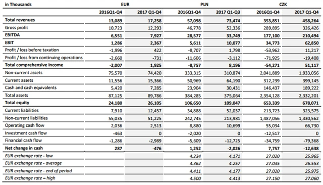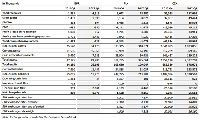 Za samotné čtvrté čtvrtletí společnost vykázala tržby 4,32 milionu eur (4Q2016: 1,98 milionu eur) a zisk EBITDA 594 tisíc eur (4Q2016: 328 tisíc eur). Na úrovni zisku EBIT vykázala společnost záporný výsledek 350 tisíc eur (4Q2016: ztráta 482 tisíc eur), ztrátu před zdaněním 917 tisíc eur (4Q2016: -1,09 milionu eur) a ztrátu z pokračujících operací 1,43 milionu eur (4Q2016: -1,79 milionu eur).