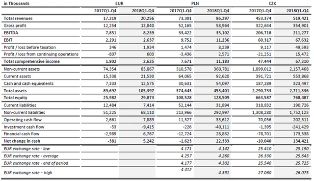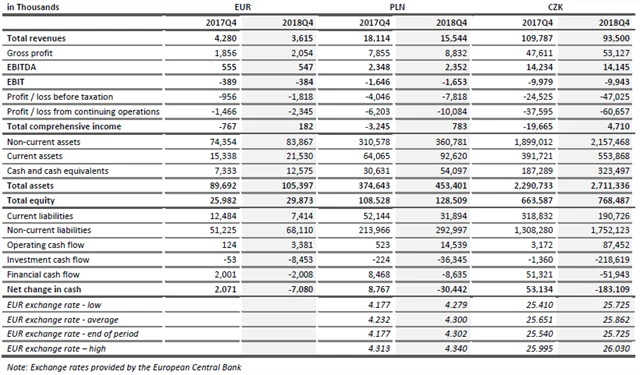 Na úrovni provozního zisku EBIT firma vykázala za loňský rok výsledek 2,64 milionu eur po 2,29 milionu eur v roce 2017. Na úrovni zisku před zdaněním vykázala 1,93 milionu eur po předloňském zisku 346 tisíc eur. Čistý zisk za rok 2018 dosáhl 603 tisíc eur, předloni společnost vykázala ztrátu 807 tisíc eur.