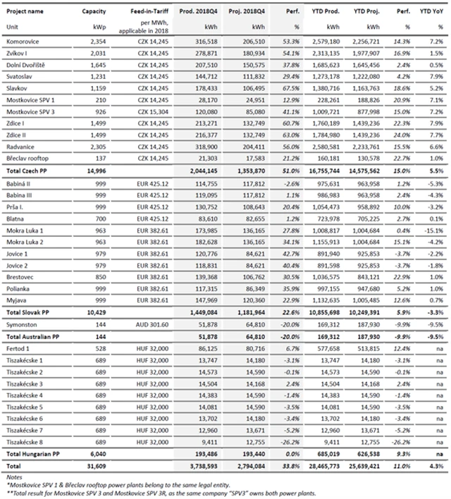 Fotovoltaické elektrárny ovládané přímo či nepřímo společností Photon Energy se souhrnným výkonem 31,609 MWp (výkon solárních panelů v bodě maximálního využití za standardních podmínek) do sítě v loňském roce dodaly 28,47 GWh elektrické energie. Meziročně se produkce zvýšila o 4,3 % a byla 11 % nad odhadem firmy. V samotném čtvrtém čtvrtletí produkce dosáhla 3,74 GWh.