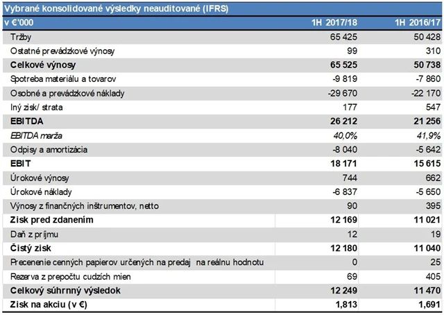 Zisk před zdaněním, úroky a odpisy (EBITDA) vzrostl firmě v prvním fiskálním pololetí meziročně o 23 % na 26,2 milionu eur a čistý zisk společnosti dosáhl 12,2 milionu eur po 11 milionech eur v prvním pololetí finančního roku 2016/2017.