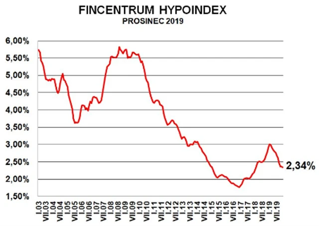 Pokles úrokových sazeb hypotečních úvěrů se v prosinci téměř zastavil. Rok 2019 zakončil hypoteční trh podle Fincentrum Hypoindexu s průměrnou úrokovou sazbou 2,34 procenta. Objemy i počty poskytnutých hypoték klesají.