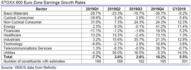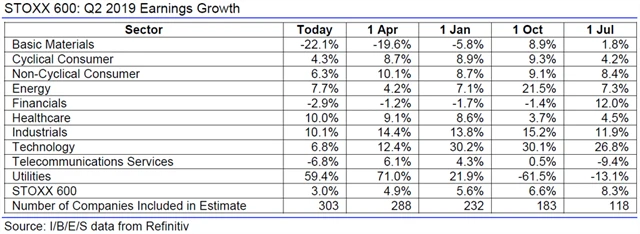 Jak se vyvíjejí odhady růstu či poklesu zisků evropských firem za 2Q2019?