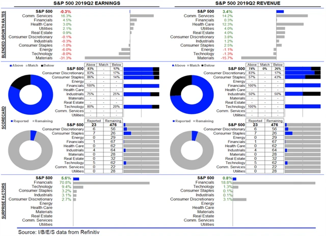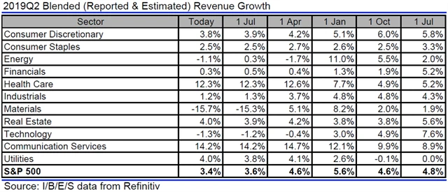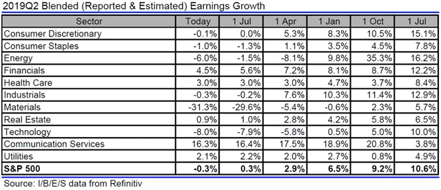 Jak se vyvíjejí odhady růstu či poklesu zisků a tržeb amerických firem za 2Q2019?