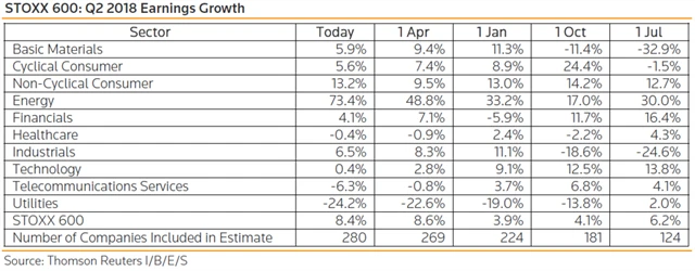 Jak se vyvíjejí odhady růstu či poklesu zisků evropských firem za 2Q2018?