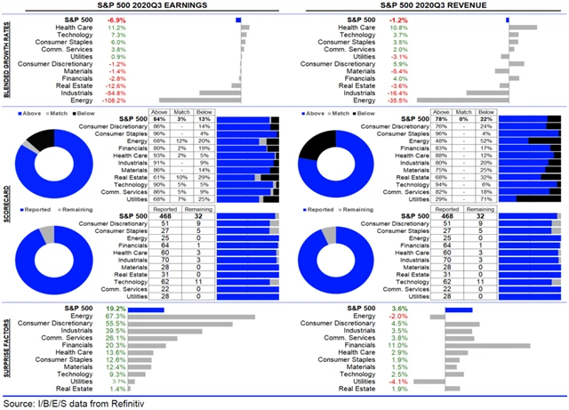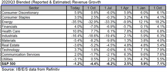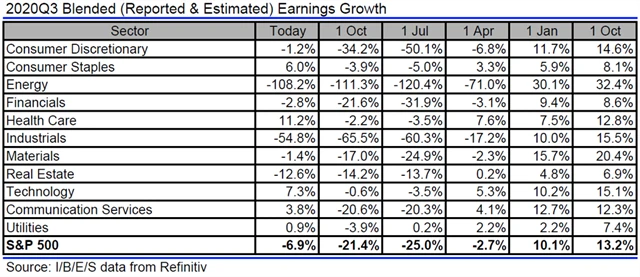 Jak se vyvíjejí odhady růstu či poklesu zisků a tržeb amerických firem za 3Q2020?