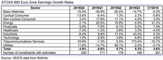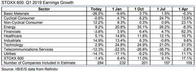 Jak se vyvíjejí odhady růstu či poklesu zisků evropských firem za 1Q2019?