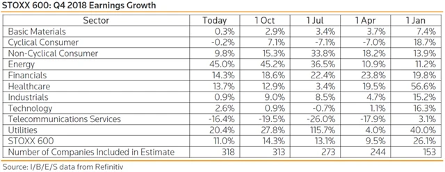 Jak se vyvíjejí odhady růstu či poklesu zisků evropských firem za 4Q2018?