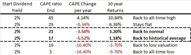 Kdybychom v příštích letech chtěli za uvedených podmínek dosahovat 10% ročního výnosu z držení amerických akcií po následujících 10 let, ukazatel CAPE (cyklicky očištěné P/E) by musel ze současné hodnoty 29 vzrůst na rekordních 45, tedy každý rok by měl vzrůst průměrně o 4,14 %. To je ideální případ v prvním řádku tabulky, pravděpodobnost této možnosti je však velice nízká.