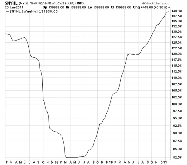 Děje se tak v situaci, kdy indexy dále posilují, a jde proto o předstihový ukazatel toho, že vrchol je možná na dohled. Čím více titulů dosahuje svých ročních maxim, tím robustnější je trh a agresivnější jsou býci. A čím méně je dosažených ročních maxim, tím více ztrácí uptrend na síle.