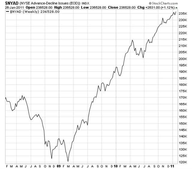 Jde o poměr počtu akcií, jež vzrostly, k počtu akcií, jež oslabily a vývoj tohoto ukazatele v čase. Zatímco indexy mohou vzhledem ke své konstrukci, váhám titulů a selektivní povaze dále růst, počínající pokles tohoto ukazatele nevěstí nic dobrého a znamená jediné – trh jako celek ztrácí dech.