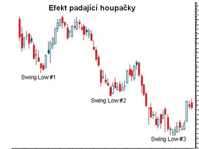 Třetím indikátorem jsou tzv. swing lows. Konkrétně bychom mohli tento jev přeložit jako „efekt padající houpačky“. Jde o situaci, kdy indexy ve sledovaném období dosahují stále nových minim. V prostředí rostoucího trhu index roste s občasnými dílčími korekcemi. Hodnota indexu po korekcích má ovšem rostoucí trend. Naopak downtrend věští situace, kdy nová minima jsou stále níže.