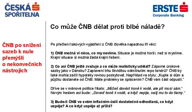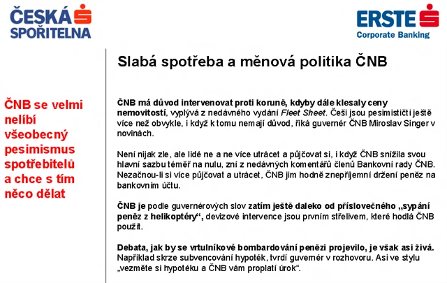 České národní bance se podle slov guvernéra Singera velice nelíbí všeobecný pesimismus spotřebitelů a chce s ním něco dělat. Zatím jsme zřejmě ještě daleko od příslovečného "sypání peněz z helikoptéry", devizové intervence jsou prvním střelivem, které hodlá ČNB použít. Debata, jak by se vrtulníkové bombardování penězi projevilo, je však zřejmě živá.