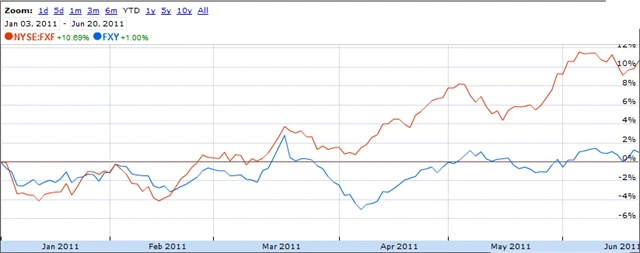 I tyto měny můžeme začlenit do portfolia pomocí ETF certifikátů – u jenu se jedná o FXY, u franku o FXF.