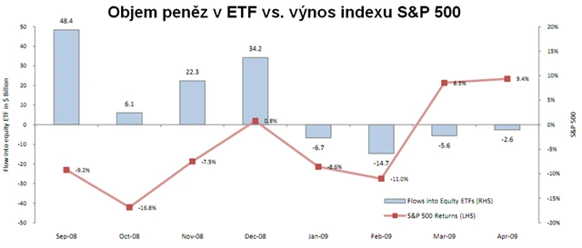 V době růstu akciového trhu v roce 2009, kdy zároveň dorazily "nové peníze", hedgeové fondy naopak akciové burzovně obchodované fondy vyprodávaly.