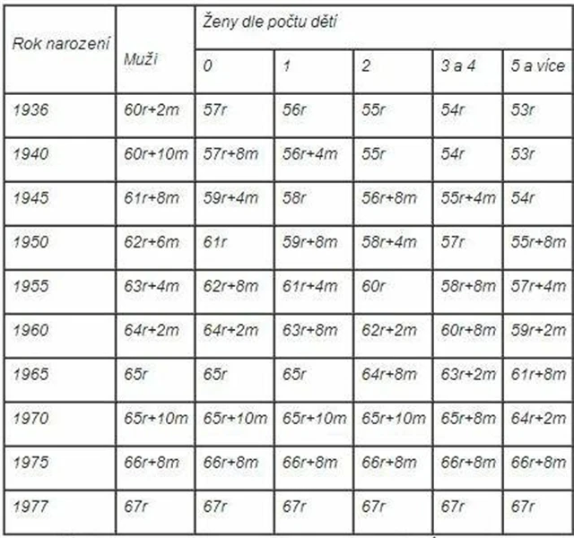- Zatímco žena narozená v roce 1950, která vychovala 3 děti, má důchodový věk 57 let, žena narozená v roce 1977 (třeba její dcera) má již důchodový věk 67 let. Důchodový věk se během jedné generace zvýšil v některých případech o 10 let.