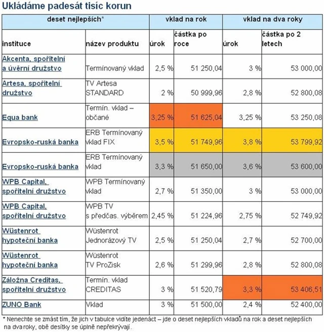 Pokud budeme chtít na termínovaný vklad uložit 50 000 korun, nejvýhodnější nabídky se dočkáme u Evropsko-ruské banky. Ta u varianty Termínovaný vklad Fix nabízí při době spoření jeden rok úrokovou sazbu 3,5 %. Z peněz však celý rok za žádných okolností neuvidíte ani troník – nemůžete si vybrat ani za cenu ztráty úroků, ani za cenu ztráty určitého procenta vložené částky a vůbec za žádnou cenu.