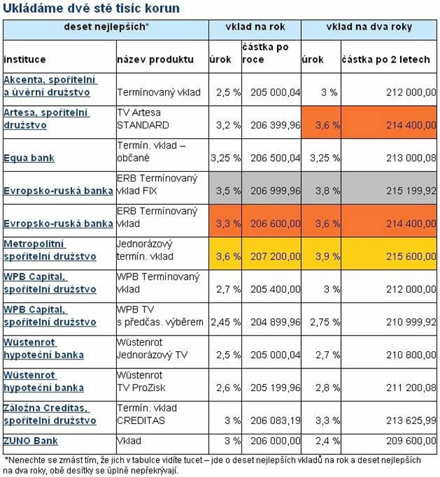Pokud porovnáváme termínované vklady u částky 200 000 korun na dobu jednoho roku a dvou let, nejvýhodnější úrok 3,6 % a 3,9 % nabízí a zlato v obou časových kategoriích získává Metropolitní spořitelní družstvo. Stříbrnou i bronzovou příčku pak u obou časových období obsadily termínované vklady u Evropsko-ruské banky s úrokem 3,5 a 3,3 % na rok a 3,8 a 3,6 % na dva roky. Úrokovou sazbu 3,6 % při uložení stejné částky na dva roky můžete získat také u spořitelního družstva Artesa.