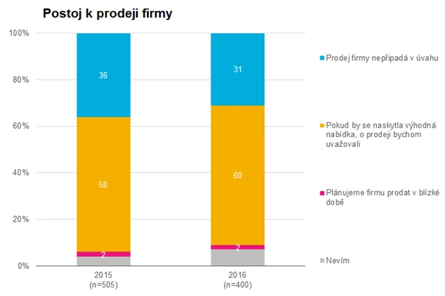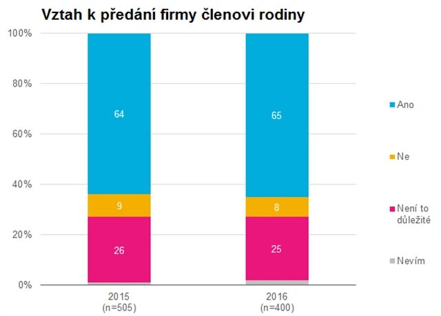 Podle průzkumu Asociace malých a středních podniků a živnostníků ČR a agentury Ipsos z loňského roku majitelé českých rodinných firem ani příliš netrvají na tom, aby firmu nakonec převzal rodinný příslušník. Považují spíše za důležité, aby firmu vedl někdo, kdo bude mít k danému podnikání a oboru vztah. Tři čtvrtiny z nich by se ani nebránily tomu, aby v managementu společnosti zasedl někdo, kdo není členem rodiny. A velká část majitelů rodinných firem by podle průzkumu dokonce zvažovala prodej podniku v případě, že by se naskytla výhodná nabídka.