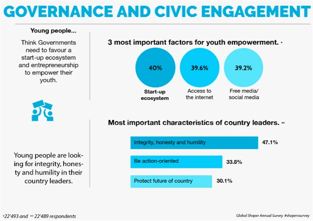 Čtyři z deseti mladých lidí si myslí, že by politici měli vytvářet prostředí podporující startupy. Dále je pro ně důležitý přístup k internetu, sociálním sítím a nezávislým médiím. Co se týče samotných politiků, oceňují mladí lidé zásadovost, čestnost, pokoru a proaktivitu.