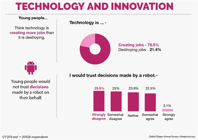Mladí lidé jsou velkými příznivci technologií. Více než tři čtvrtiny z nich vyjadřují názor, že technologie pomáhají vytvářet pracovní místa. Názor, že kvůli technologiím pracovní pozice zanikají, zastává jen zhruba 21 % oslovených. Na druhou stranu však více než polovina mladých lidí přiznává, že by nedůvěřovala rozhodnutím, která by za ně činila umělá inteligence.