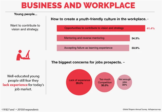 Co se týče pracovního trhu, bezmála 40 % lidí, jimž se dostalo kvalitního vzdělání, si myslí, že je škola nedostatečně připravila na praxi. Tři z deseti lidí vyjadřují názor, že na trhu práce je příliš velká konkurence, a asi 23 % oslovených si myslí, že na trhu práce není dostatek příležitostí. Mladí lidé také požadují, aby mohli v práci spolurozhodovat o klíčových věcech a aby na jejich chyby bylo pohlíženo jako na zdroj ponaučení, ne jako na projev slabosti a nekompetentnosti.