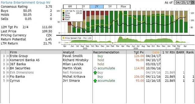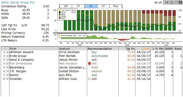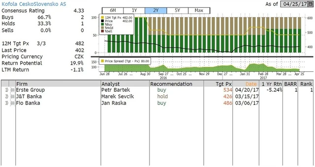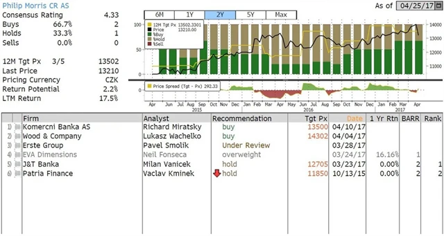 Jaký názor mají na akcie Philip Morris ČR, Fortuny, Stock Spirits a Kofoly ČeskoSlovensko domácí a zahraniční analytici? Jaké jsou jejich 12měsíční cílové ceny a jak znějí jejich aktuální investiční doporučení? Nabízíme kompletní přehled, jak jej k 25. 4. 2017 shromáždila agentura Bloomberg.