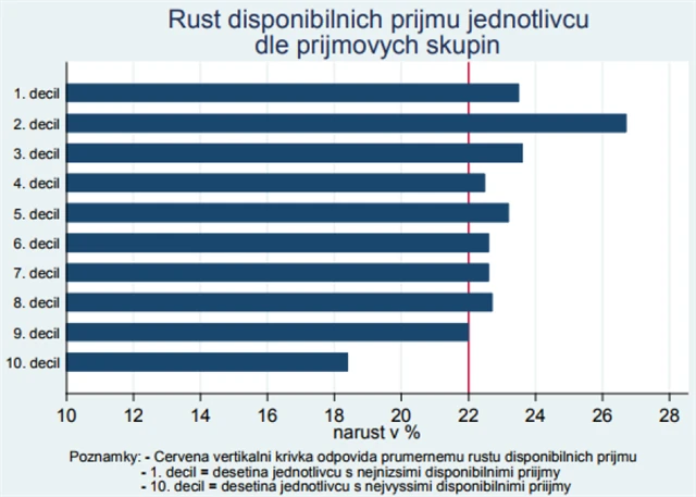 Studie ukazuje, že spíše nikoli. Nejpomaleji totiž disponibilní příjmy domácností rostly u nejbohatších 10 % z nich. U všech ostatních decilů disponibilní příjmy vzrostly minimálně o průměrných 22 %. Zajímavé je, že nejrychleji rostly příjmy u druhého nejchudšího decilu.