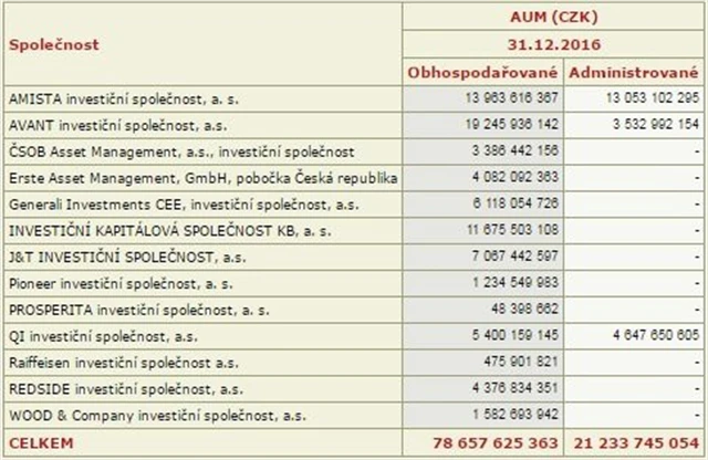 Poznámka: Objem obhospodařovaného majetku zahrnuje aktiva fondů obhospodařovaných daným subjektem (nebo "členem AKAT ČR") bez ohledu na to, zda tentýž subjekt poskytuje rovněž službu administrace. Objem administrovaného majetku zahrnuje aktiva fondů, které uvedený subjekt administruje, ale přitom nejsou obhospodařovány jiným členem AKAT ČR. Data za některé členy AKAT ČR zahrnují rovněž majetek příslušné finanční skupiny, nikoli pouze majetek klientů (třetích stran).