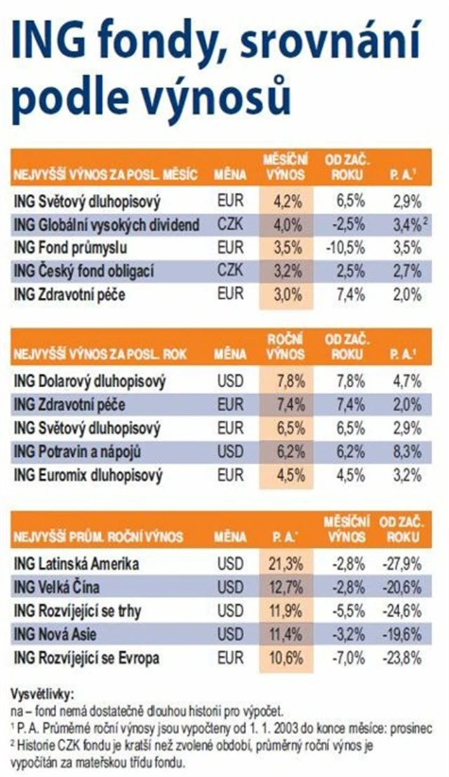 Mezi ING fondy se přesto do pětice nejúspěšnějších fondů probojovaly dva akciové: ING Zdravotní péče (+6,9 %) a ING Potravin a nápojů (+6,2 %).