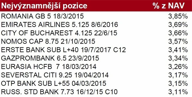 DK: Russian Agricultural Bank je významná ruská banka investičního ratingu, majoritním akcionářem je ruský stát. Romania – státní dluhopis Rumunska je na pomezí investičního ratingu, výhodou Rumunska jsou na rozdíl od periferie eurozóny příznivé úrovně a trendy v státní zadluženosti a deficitu rozpočtu. Emirates Airlines je světový lídr v oboru, který, ačkoli nemá přidělen rating, disponuje dobrým finančním fundamentem. City of Bucharest je municipální dluhopis hlavního města Rumunska, kde je neinvestiční rating vyvážen vysokým výnosem. Nomos Bank je finančně zdravá ruská banka, kde platí totéž.