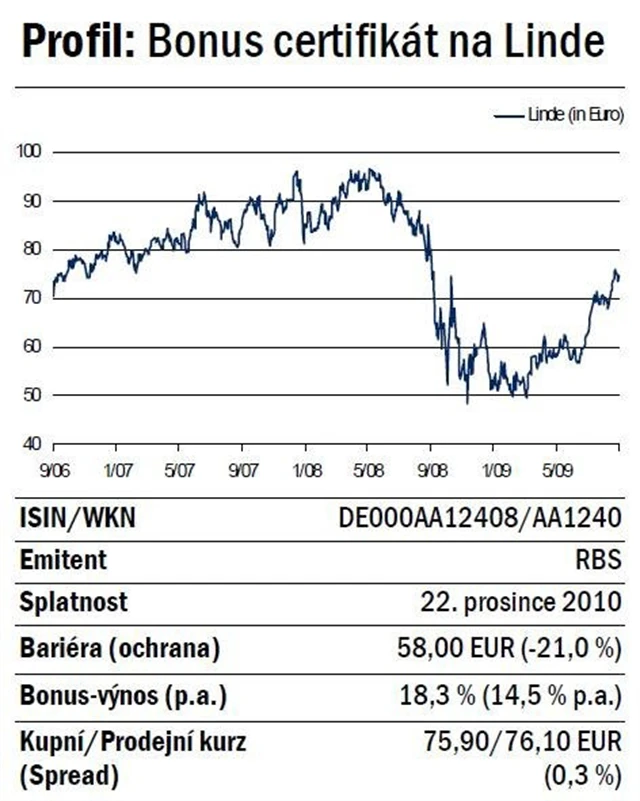 Bonus certifikát od RBS se nyní nabízí k nákupu. Při splatnosti v prosinci 2010 nabízí bonus výnos ve výši 18,3 procent neboli 14,5 procent p.a., pokud nedojde k prolomení bariéry na úrovni 58,00 EUR, což odpovídá ochraně ve výši 21 procent.