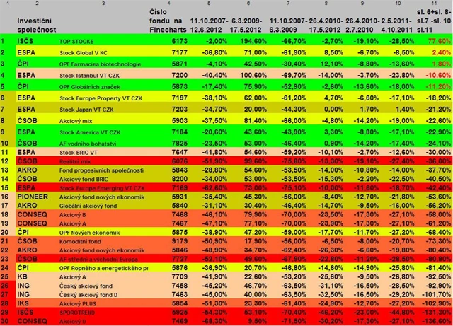 V textu jsem předložil výsledky zkoumání výkonnosti podílových fondů těch investičních společností, které jsou sdruženy v asociaci AKAT ČR. To byl také zdroj informací o hodnotách podílových listů. Hodnotil jsem jen ty fondy, jejichž historie byla dohledatelná alespoň po konec roku 2007, tedy do období před velkými propady kapitálových trhů. Pro připomenutí zde publikuji tehdejší seznam hodnocených fondů, fondy jsou seřazeny od nejlepšího po nejhorší v závislosti na jejich výkonnosti ve vybraných obdobích.