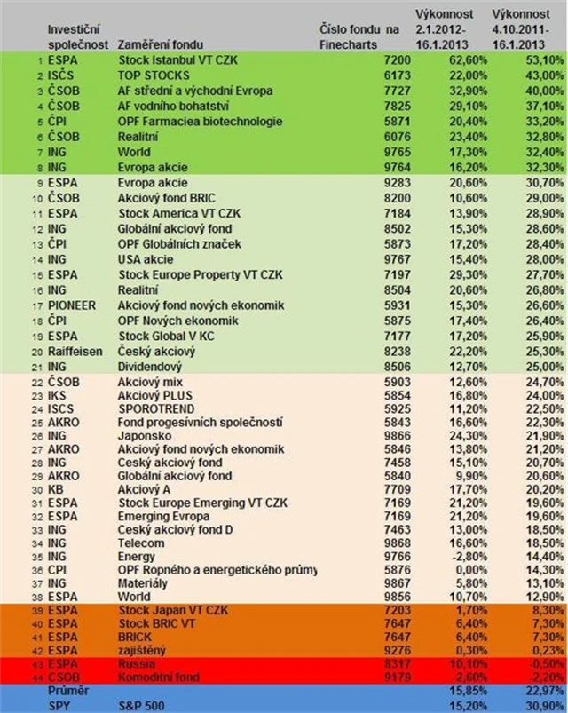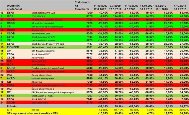 Změnilo se jen málo. Mezi nejlepší fondy se dostaly jen dva fondy od ČSOB, jinak nejlepší minulé fondy zůstaly nejlepšími. Od předchozí tabulky se tato liší posledními třemi sloupci. Ty obsahují informace o výkonnosti v období října 2007 až ledna 2013 (třetí sloupec odzadu), za právě uplynulý rok (druhý sloupec odzadu) a od cenového dna na podzim 2011 do současnosti (poslední sloupec).