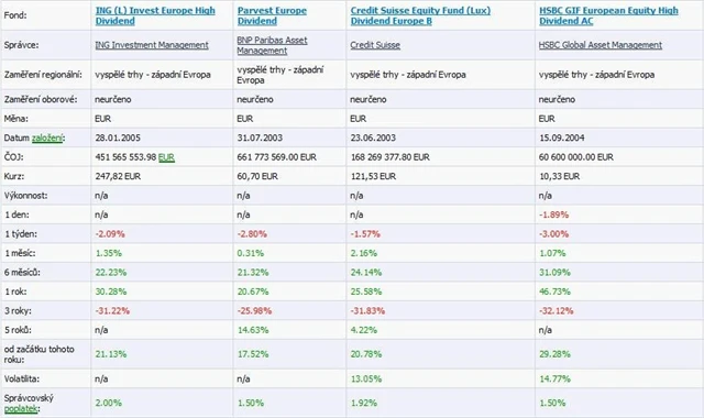 Širší nabídku budeme mít, akceptujeme-li i fondy denominované do eura. Těch najdeme celou řadu, v tabulce uvádíme srovnání těch nejvýznamnějších zaměřených na evropské dividendové akcie.