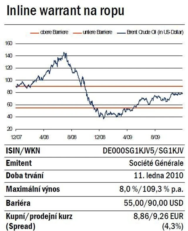 Inline warrant od Société Générale, který se vztahuje na ropu typu brent, nabízí krátce po novém roce velmi atraktivní šanci na výnos. Pokud se cena ropy do 11. ledna 2010 ani jednou nepropadne pod 55,00 USD a zároveň ani jednou nepřekoná 90dolarovou hranici, vyplatí Francouzi rovných 10,00 EUR. S ohledem na aktuální kurz warrantu je ve hře maximální výnos osm procent neboli v přepočtu 109,3 procent p.a. Pokud by však cena ropy jen jedinkrát v následujícím měsíci jednu z hranic porušila, propadne warrant okamžitě jako bezcenný.