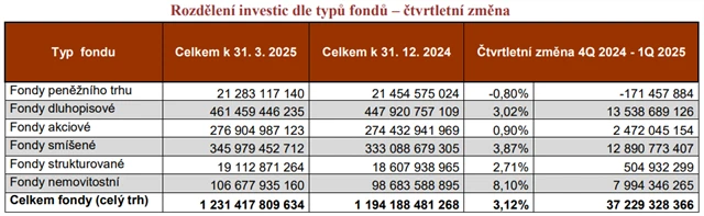 Hodnota majetku v zahraničních fondech kolektivního investování za čtvrtletí narostla asi o šest miliard korun (+2 %) a domácí fondy zaznamenaly nárůst o zhruba 29 miliard (+3 %). Skoro 90 % objemu majetku je drženo fyzickými osobami, zhruba desetinu drží právnické osoby.