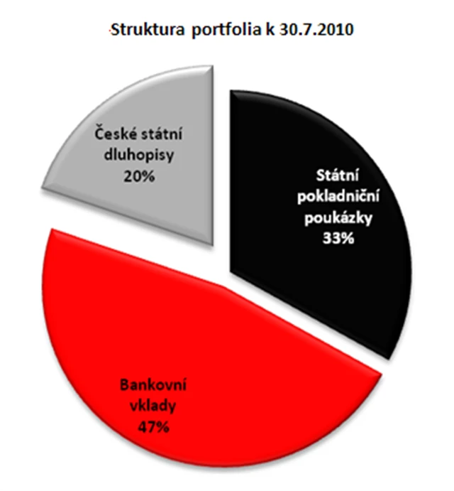 Většinu tvoří depozitní vklady (termínové vklady), zbylá část prostředků je investována do státních pokladničních poukázek a českých státních dluhopisů. Do budoucna uvažujeme držet v portfoliu část pozic ve firemních dluhopisech.