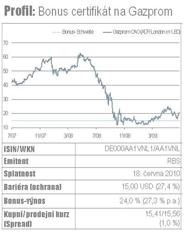 Vhodnou investicí do tohoto podkladu se jeví bonus certifikát. RBS nabízí měnově nezajištěný certifikát, který má jako podklad právě londýnské ADR a splatnost v červnu 2010. Pokud nebude prolomena bariéra na 15,00 USD (ochrana 27,4 procenta), vyplatí certifikát v přepočtu 27,50 USD. Při současných směnných kurzech tedy bonus-výnos činí 24,0 procenta.