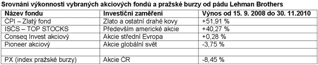 Budeme-li hodně zjednodušovat a uvedeme-li si jako počátek krize 15. září 2008, kdy kapitulovala banka Lehman Brothers, máme pro drobného korunového střádala dobrou zprávu. Pokud měl před těmi 27 měsíci uložené nějaké peníze v akciových fondech, tak udělal pomalu nejlíp, když s nimi neudělal vůbec nic. Toto obecné tvrzení samozřejmě neplatí pro všechny fondy, ale podíváme-li se na tabulku, která nám udává výkonnost některých korunových akciových fondů za toto období, je zřejmé, že trpělivost růže přináší.