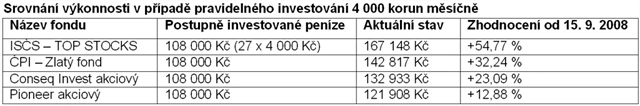 Ještě zajímavější výsledky dostaneme, rozložíme-li si celou investici po pádu Lehman Brothers do jednotlivých měsíců a každý měsíc pošleme na účet libovolného fondu třeba čtyři tisícovky. Výkonnost nad 50 % je jistě zajímavou odměnou této zkoušky trpělivosti, zvlášť uvědomíme-li si, že takto pravidelně lze do fondů posílat řádově již stokoruny měsíčně.