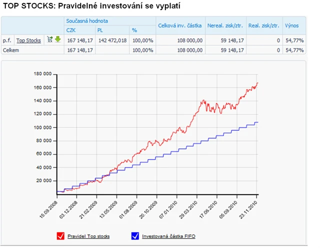 Rozdíl mezi zhodnocením fondu oproti pravidelně investované částce je patrný z níže uvedeného grafu vývoje investic ve fondu TOP STOCKS.