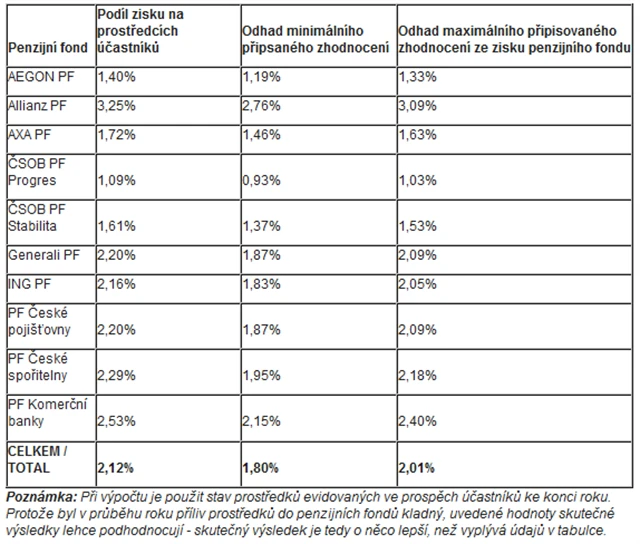 V tabulce uváděný odhad maximálního zhodnocení připsaného účastníkům penzijního fondu uvádí maximální výši zhodnocení, které může penzijní fond připsat, aniž by akcionář výnosy dotoval z vlastních zdrojů. Pokud by si akcionář nenechal nic pro sebe, dostaly by se účastníci dalších dvou fondů nad úroveň inflace. Pouze klienti dvou penzijních fondů (ČSOB PF Progres a AEGON PF) by byli v reálné ztrátě.