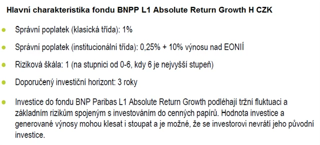 EH: Mezi fondy BNPP IP v české koruně je BNPP L1 AR Growth nejméně dynamický, cíluje volatilitu okolo šesti procent a výnos s nízkou korelací k tradičním třídám aktiv. Cíluje tedy na konzervativního investora s investičním horizontem od tří let s cílem uchovávat reálnou hodnotu úspor a s averzí vůči měnovému riziku.