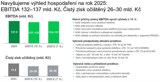 Celkově příznivé první pololetí ČEZ vedlo ke zlepšení celoročního výhledu. Zatímco dosud management za celý rok čekal EBITDA 127-132 miliard korun a očištěný čistý zisk 25–29 miliard, nově hovoří o EBITDA 132–137, respektive očištěném zisku 26–30 miliard. Zlepšený výhled podporují vysoké prodejní ceny vyrobené elektřiny, nižší provozní náklady nebo vyšší výnosy z distribuce a připojovací poplatky.
