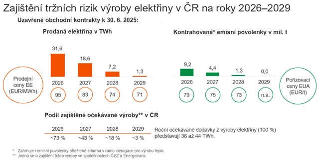 V rámci zajišťování tržních rizik výroby měl ČEZ v Česku ke konci června pro rok 2026 předprodáno 31,6 TWh elektrické energie za průměrnou cenu 95 eur/MWh, pro rok 2027 asi 18,6 TWh elektřiny za cenu 83 eur/MWh a pro rok 2028 přes 7 TWh elektřiny za 74 eur/MWh.