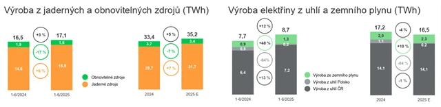 Výroba elektřiny v prvním pololetí byla meziročně vyšší o 6 %, dosáhla 25,7 TWh. Výroba z jaderných zdrojů se meziročně zvýšila o 6 % na 15,5 TWh, zatímco výroba z obnovitelných zdrojů spadla o 17 %. Tento pokles byl dán rokem 2024, který byl mimořádně silný díky příznivým přírodním podmínkám. Celkově výroba z jaderných a obnovitelných zdrojů byla v prvních šesti měsících letošního roku meziročně vyšší o 3 % a dosáhla 17,1 TWh.